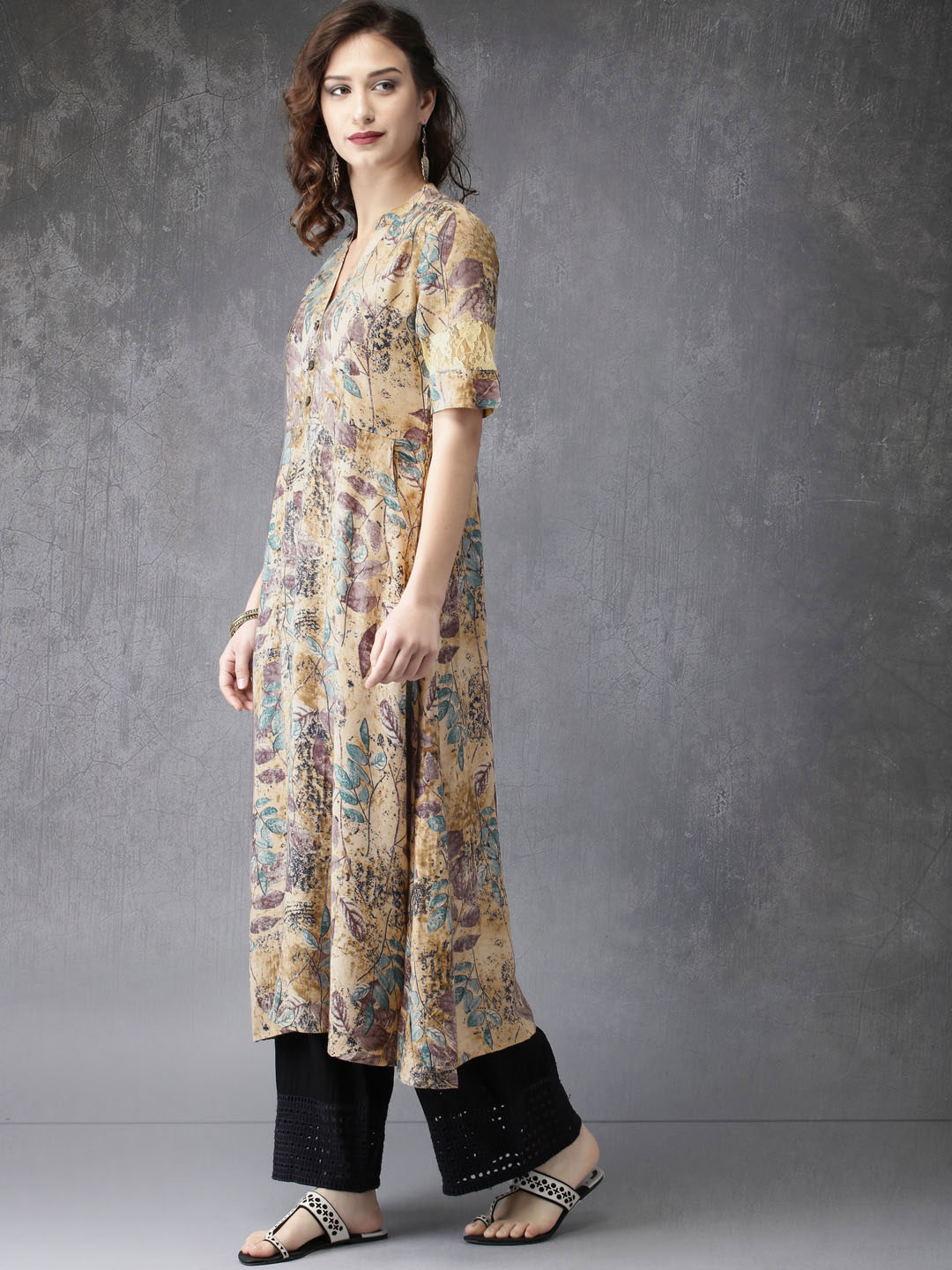Make a statement with this elegant kurta from Anouk. For your next dinner party or family gathering, this Beige Printed kurta pairs well with dark leggings and chic flats. Beige printed A-line kurta, short sleeves, flared hem