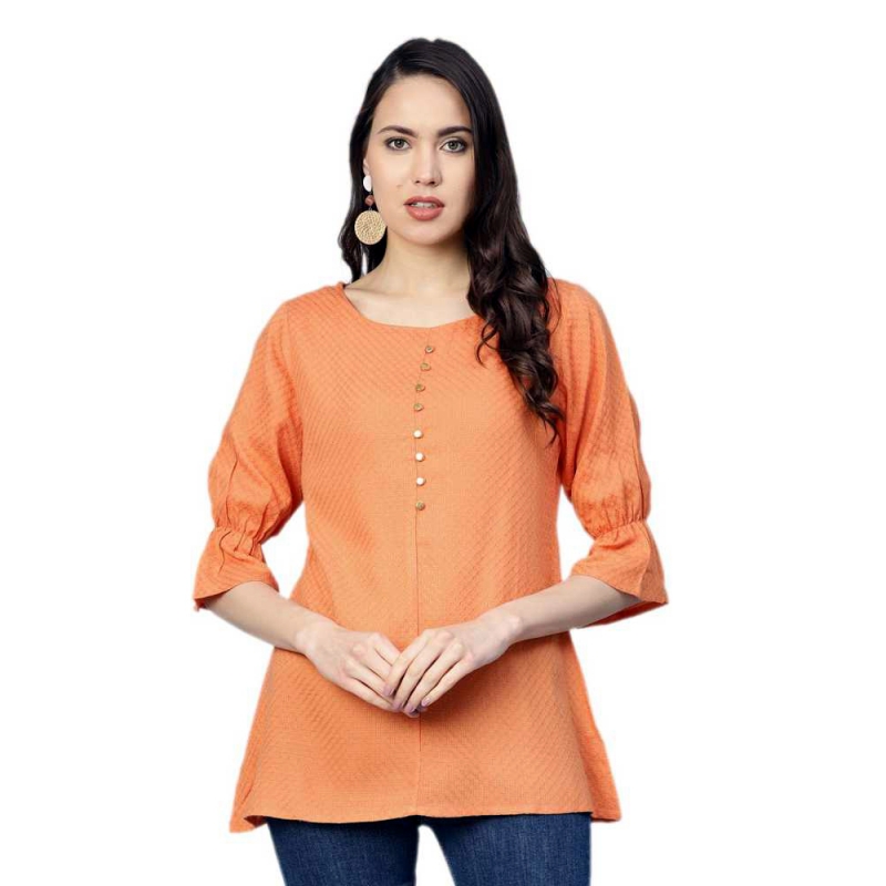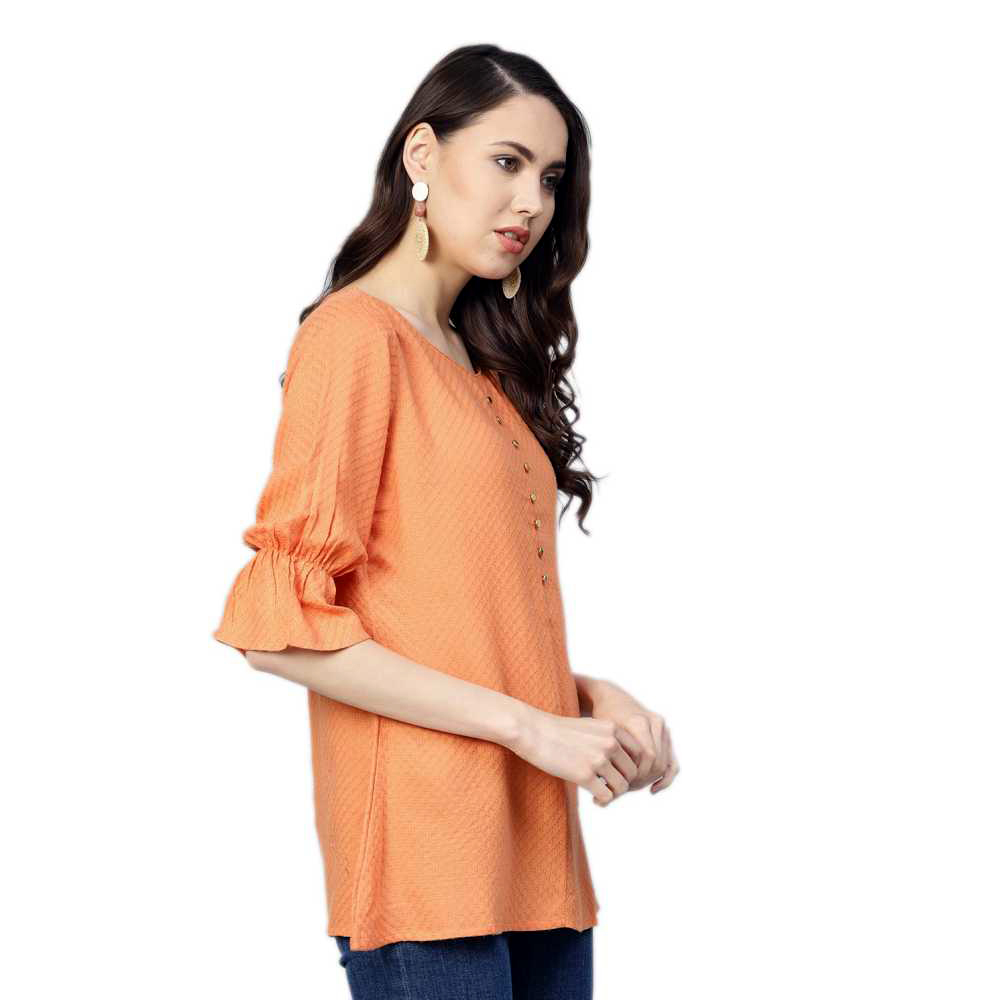 This Tunic has featuring with Boat neck which enhanced with buttons on front pannel, dobby print,3/4th Bell sleeves,straight hemline.Tunic has made from rayon fabric.