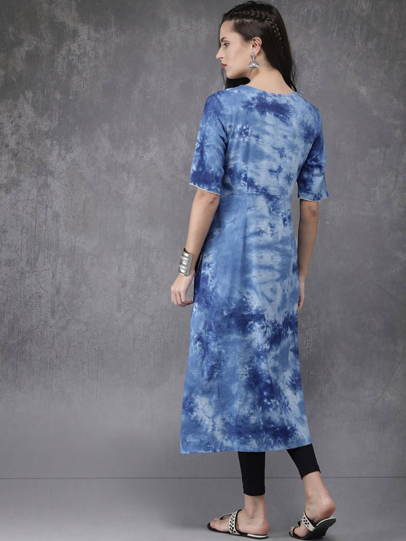 Make a statement with this elegant kurta from Anouk. For your next dinner party or family gathering, this blue piece pairs well with dark leggings and chic flats.Blue printed A-line kurta, has a round neck, short sleeves, flared hem, front slit