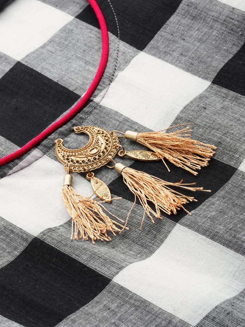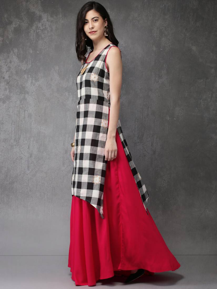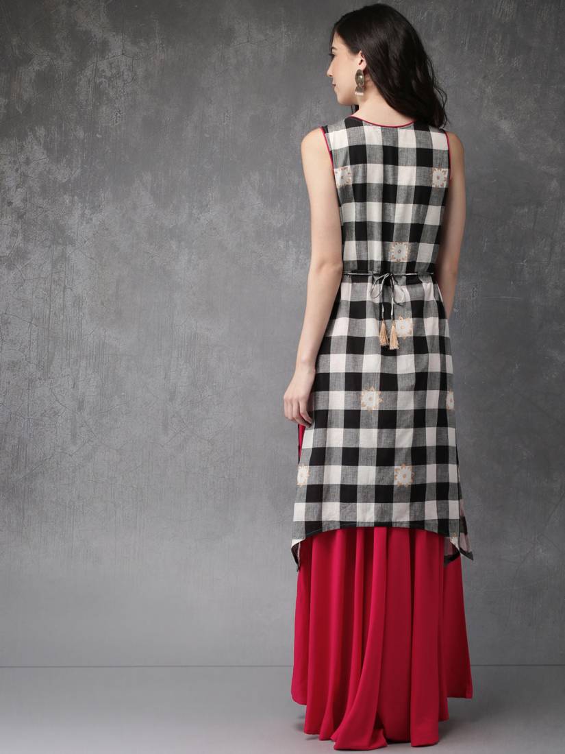 Black And Grey Checked A-line Kurta, Has A Round Neck, Sleeveless, Asymmetrical Hem, Side Slits