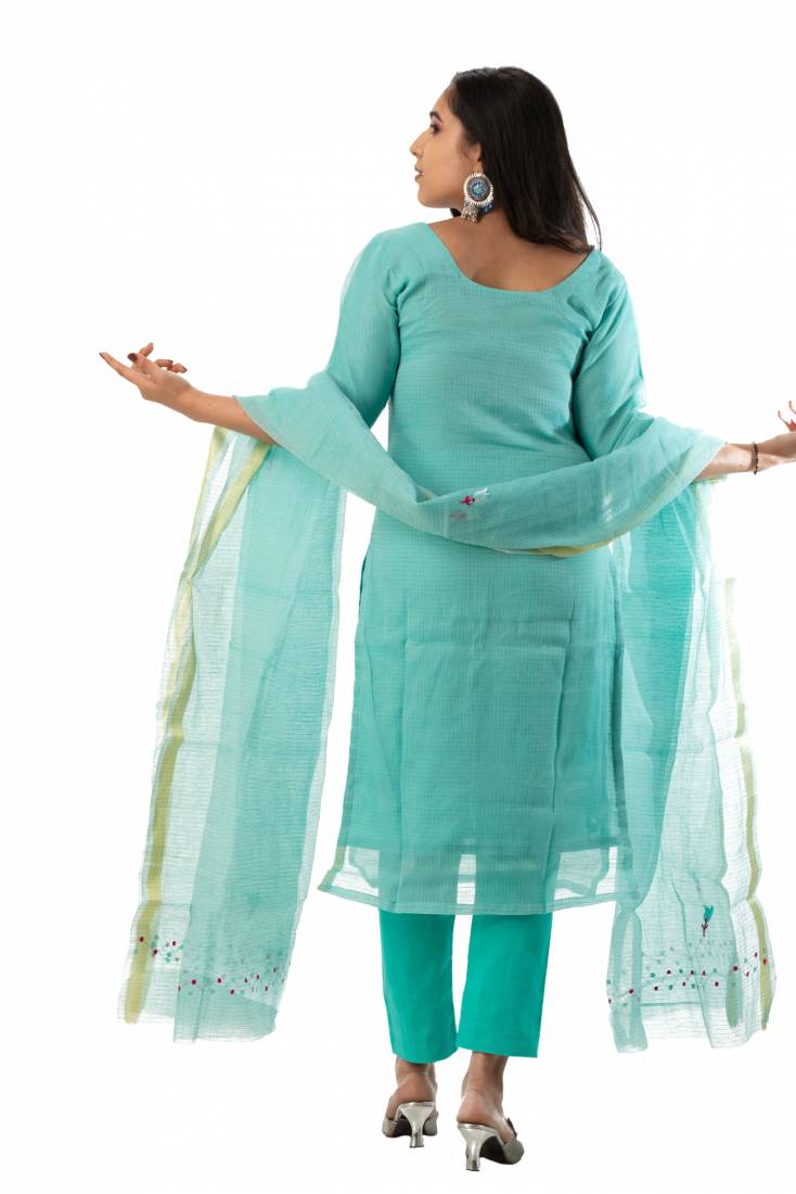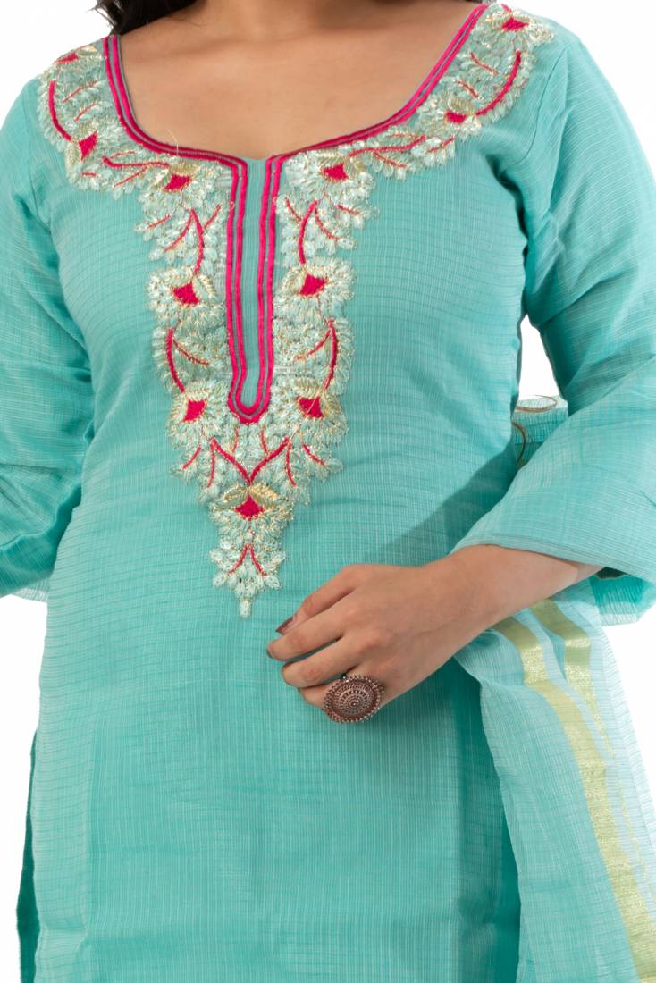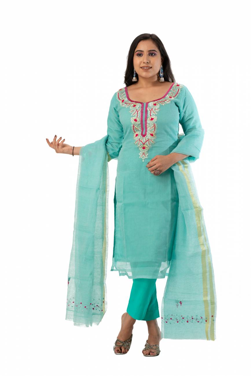 Madhulika brings to you this dress material which is made from Kota Doria and. This fabric has been designed keeping in mind the latest trends in an ethnic and casual fashion. The fabric combines ethnic with the fashion of today and makes you stand out among others when you adorn it.