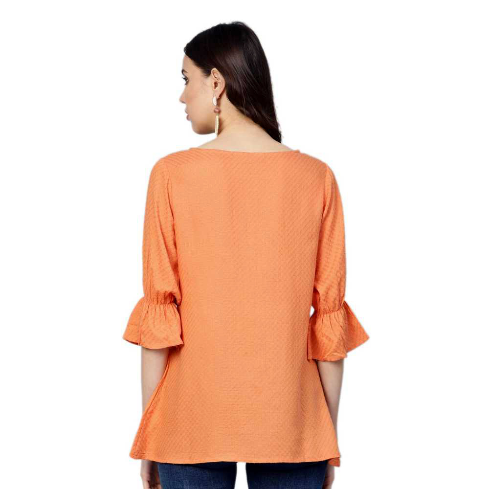 This Tunic has featuring with Boat neck which enhanced with buttons on front pannel, dobby print,3/4th Bell sleeves,straight hemline.Tunic has made from rayon fabric.