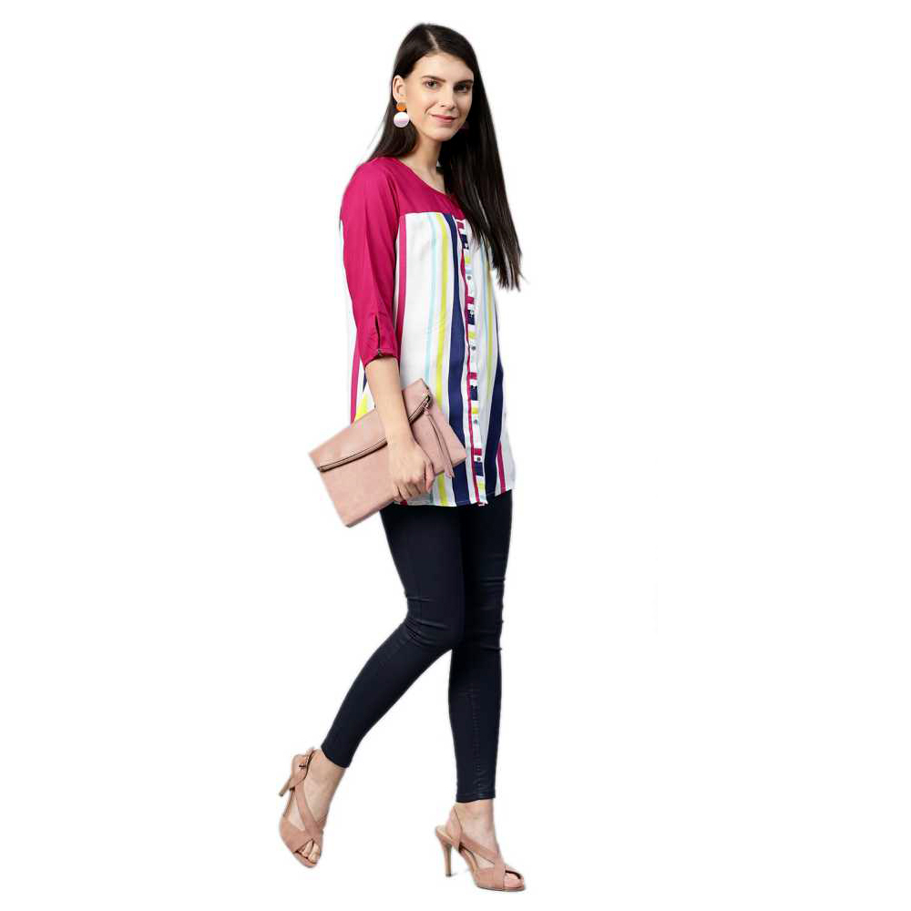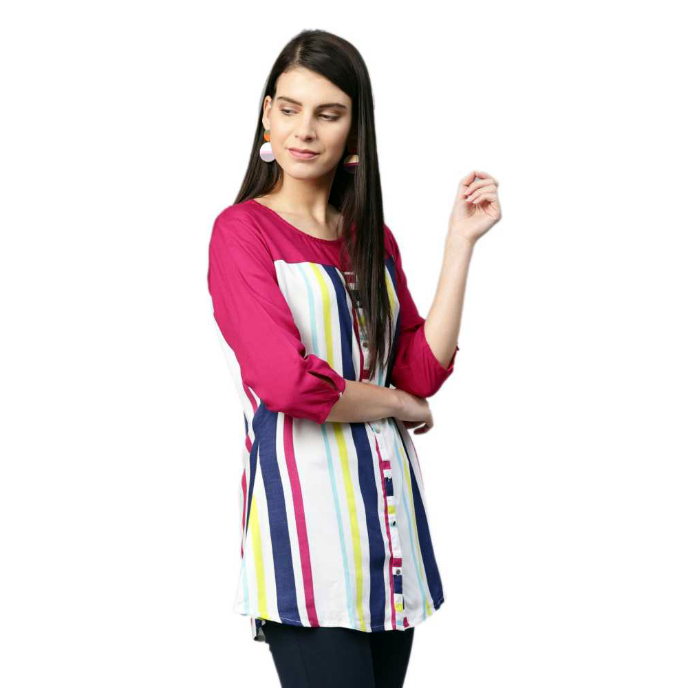 This Tunic Has Featuring With Round Neck Which Enhaced With Buttons On Front,3/4th Sleeves.Striped Print Has Enhaced The Beauty Of The Tunic.it Has Made From Rayon Fabric.