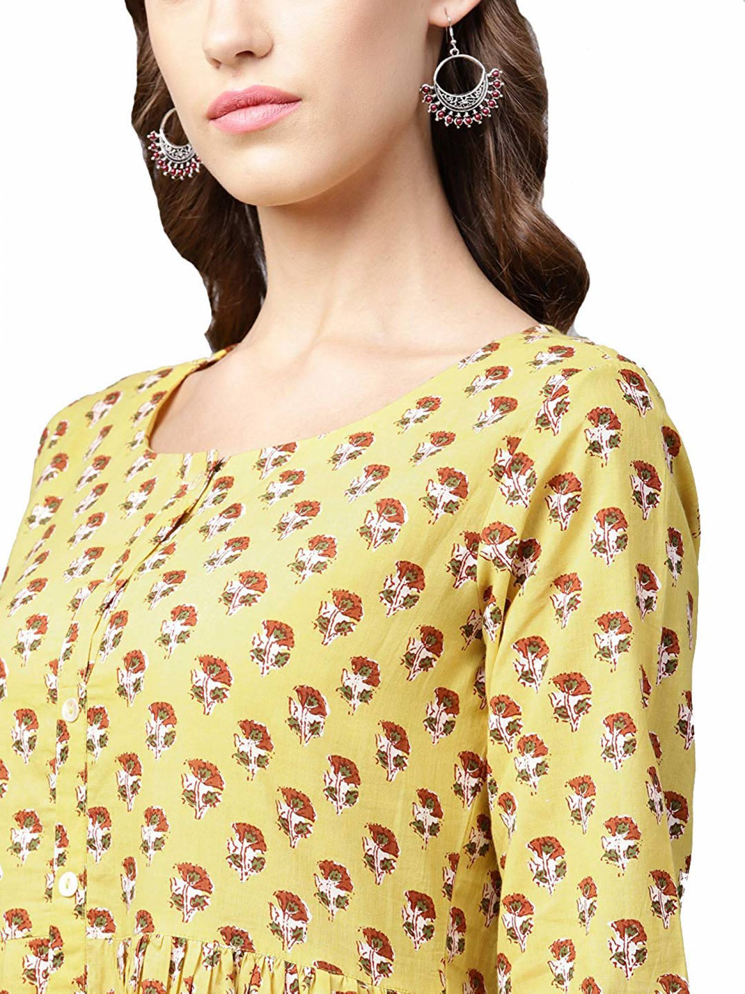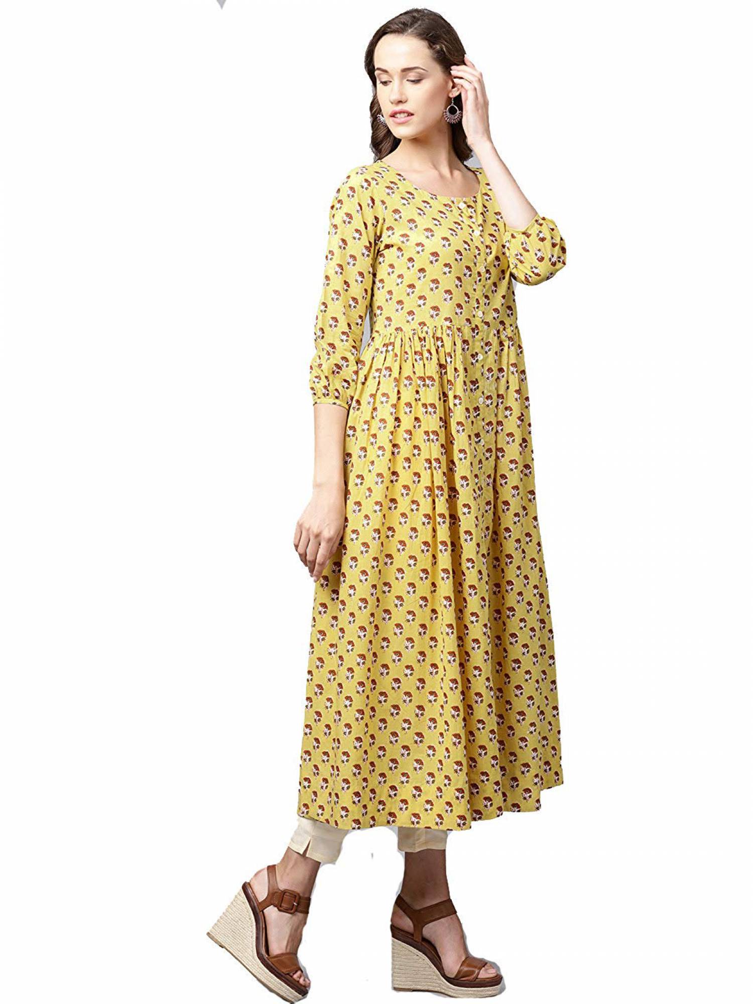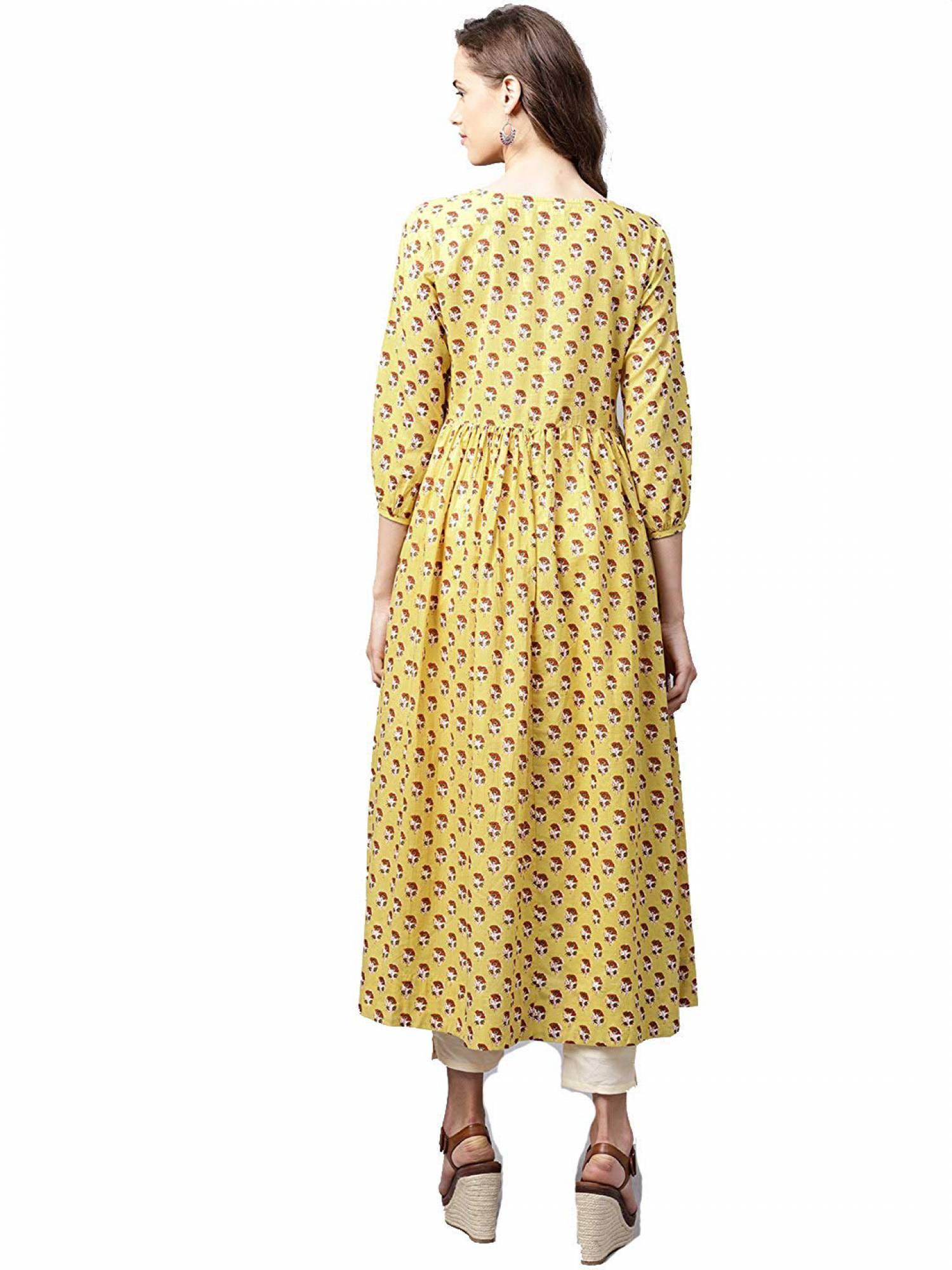 Varanga Yellow print A line kurta,3/4 th sleeves, mandarin neckline, flared hemline. . Fabric:Kurta-pure cotton . Collar:Round Neck . Number of items: 1 . Colour:Kurta-multi